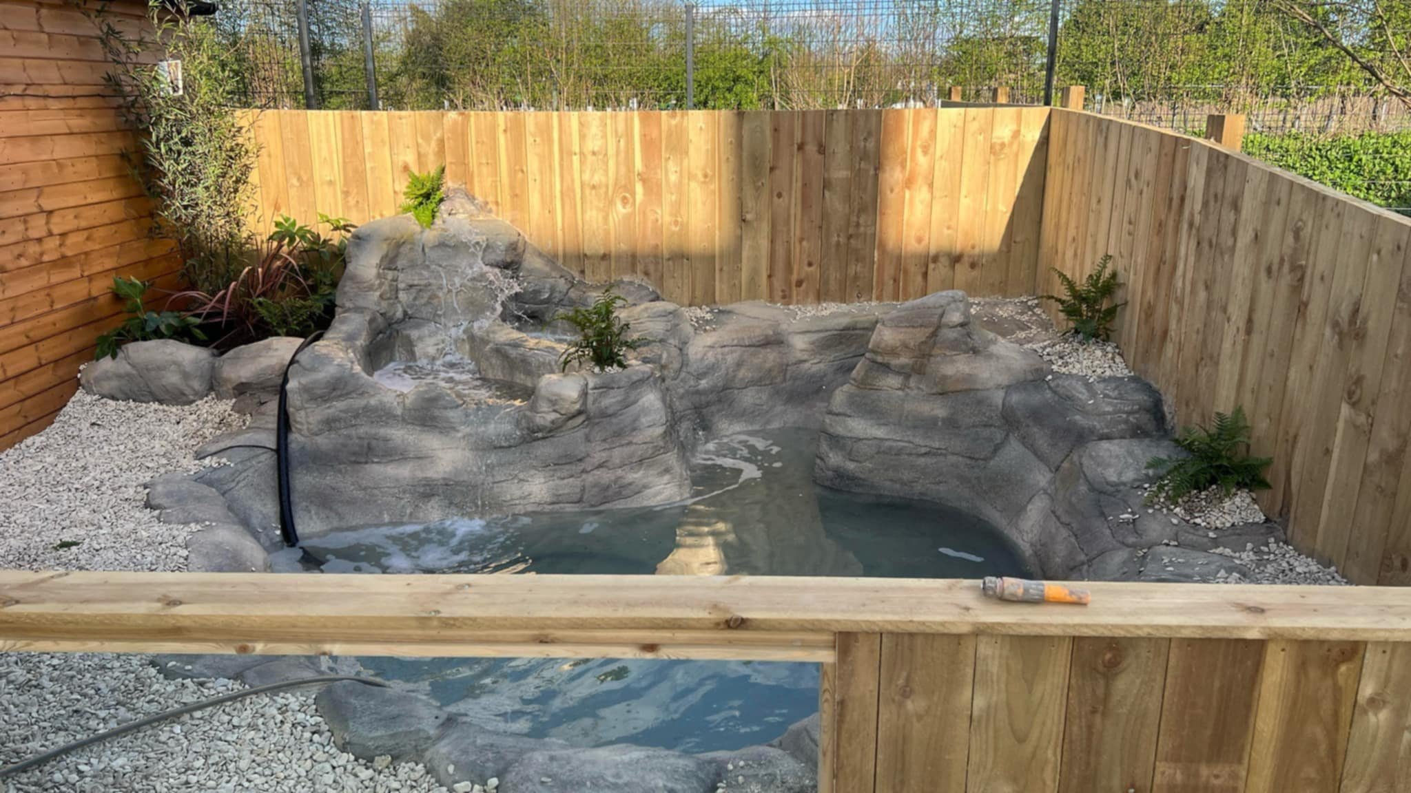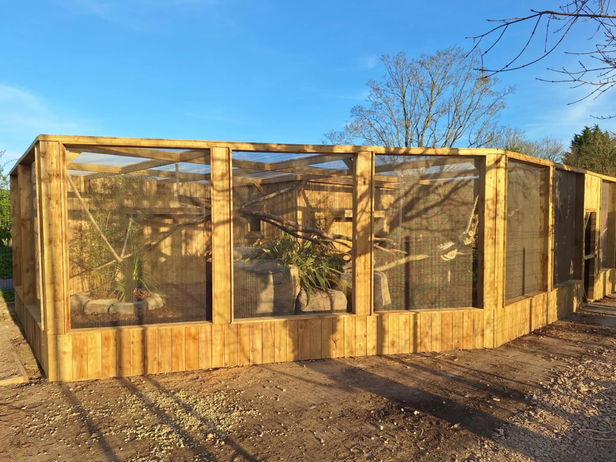 Adjacent to this, we constructed two purpose-built aviaries positioned over a pond system, designed specifically for terrapins and other aquatic or semi-aquatic species. These aviaries combine safe, predator-resistant netting with durable timber and steel frameworks, while the waterbody itself has been shaped to allow natural basking, swimming, and feeding behaviours. Elevated perches and planting further enrich the space and showcase mixed-species design possibilities for students.