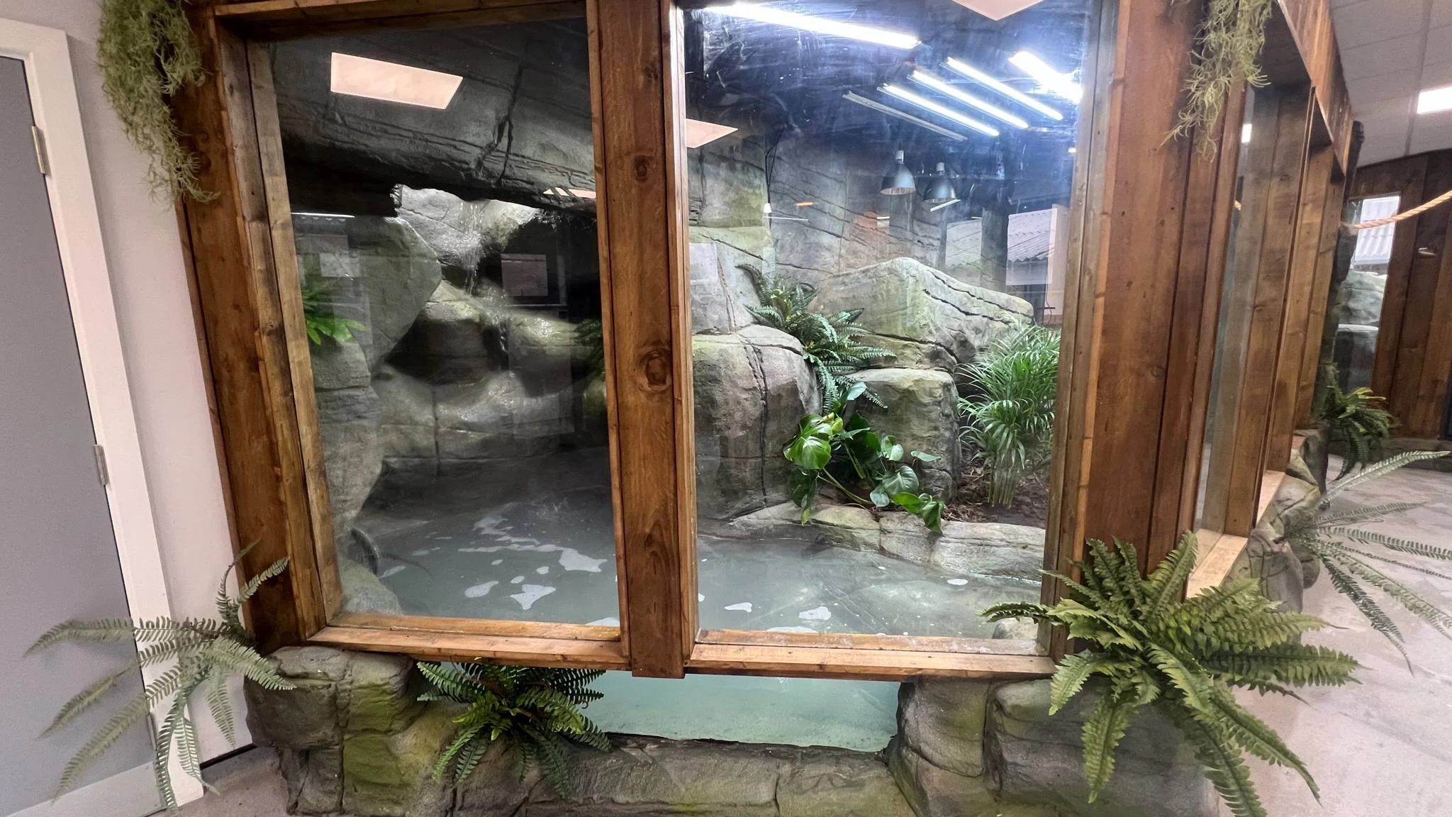 Indoor enclosure with glass windows, wooden frame, and rocks, containing green plants and ferns, resembling a zoo or wildlife exhibit.
