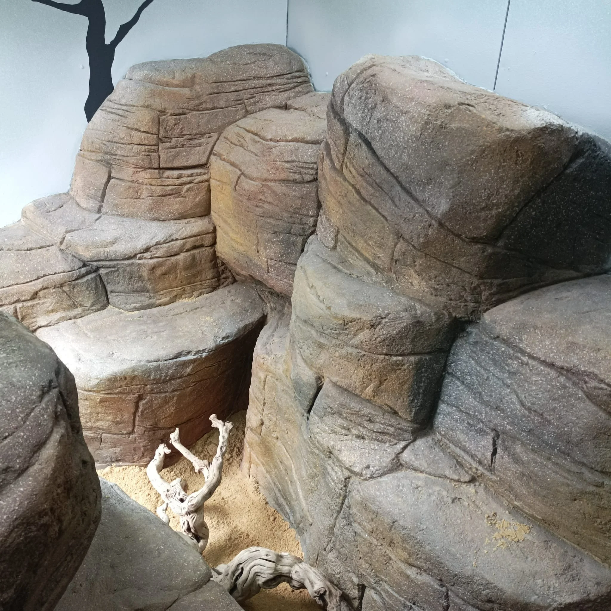 Artificial rock formation with beige and brown tones, with a sandy area at the bottom containing a piece of twisted, weathered driftwood.