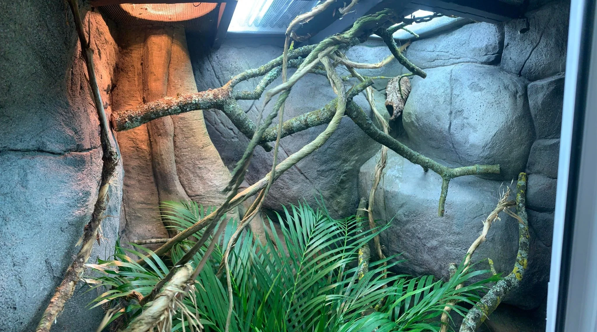 Enclosure with artificial rocks, branches, and green tropical plants inside.