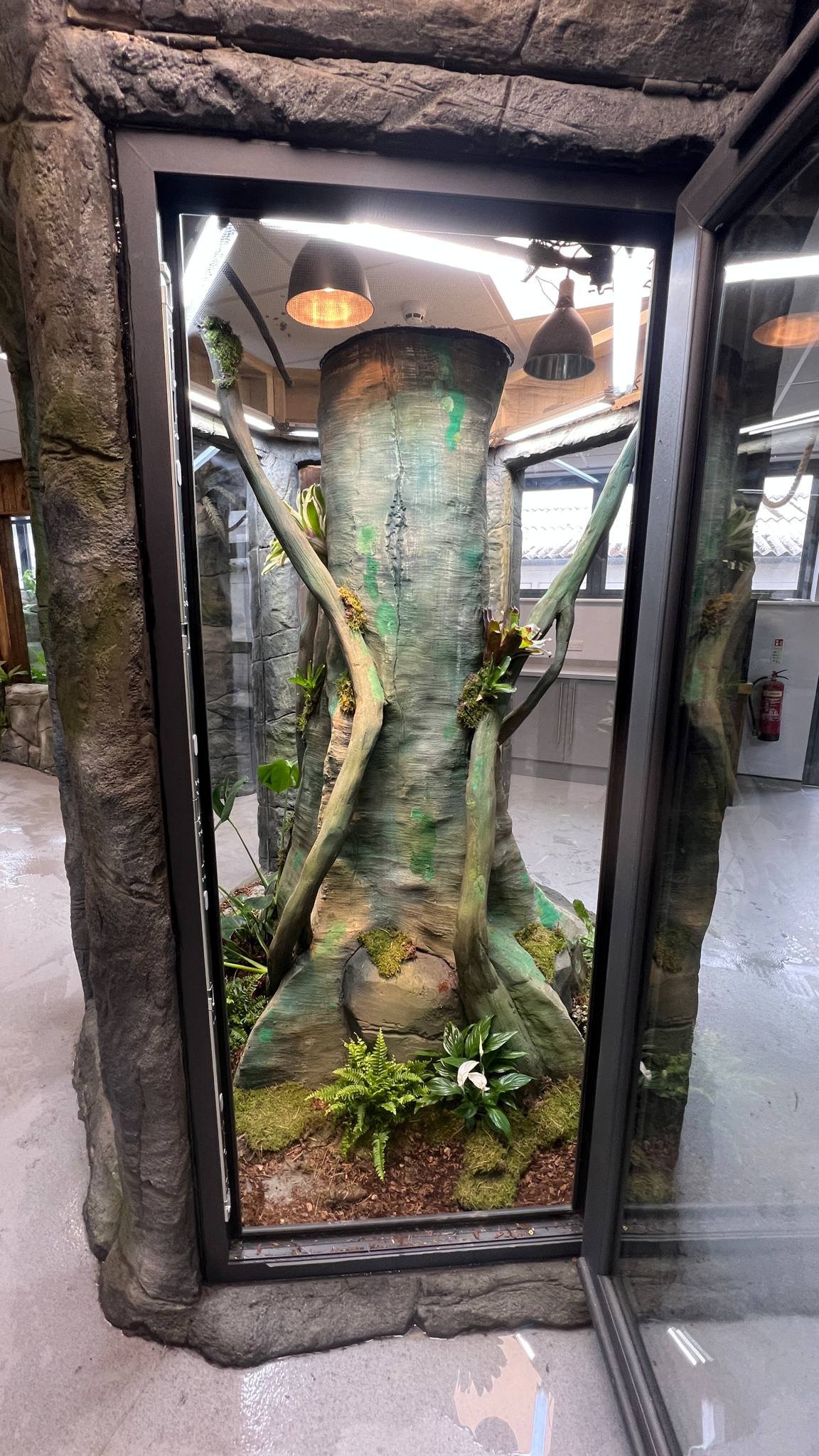A glass enclosure with a faux tree trunk inside, decorated with plants and vines, resembling a natural forest scene.