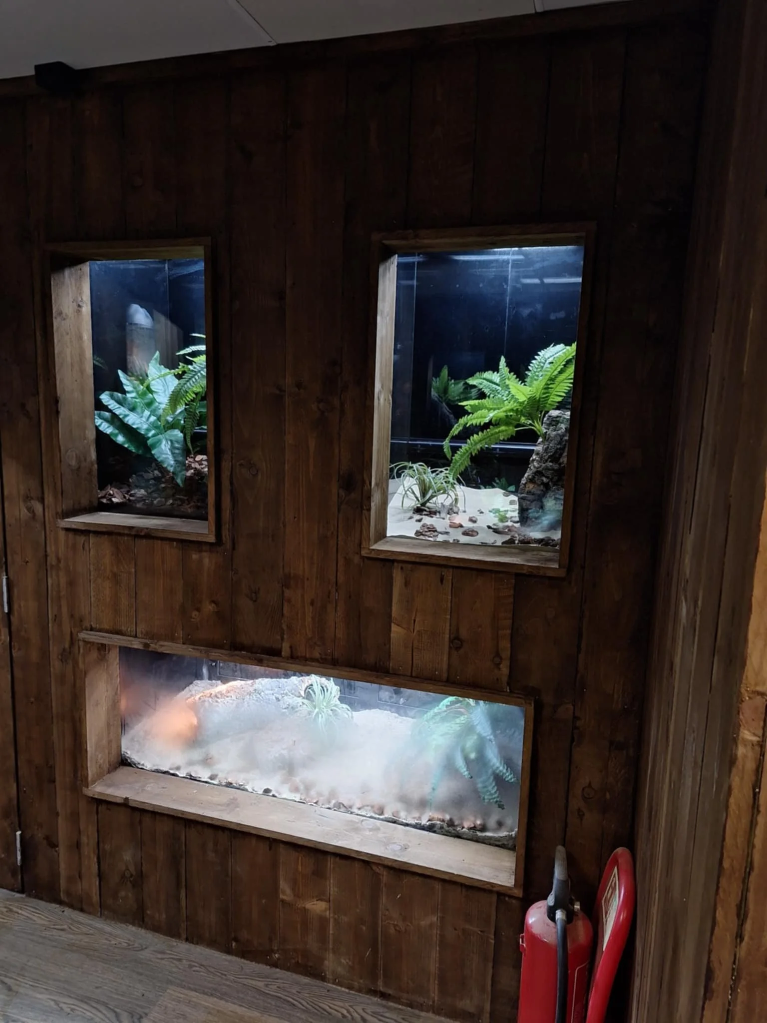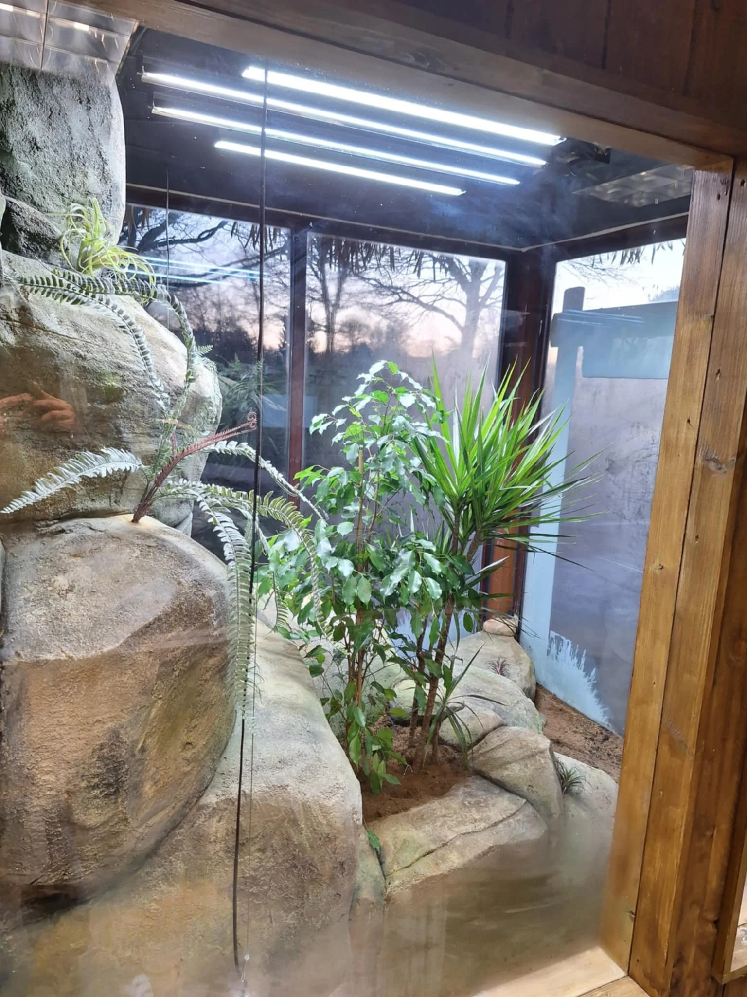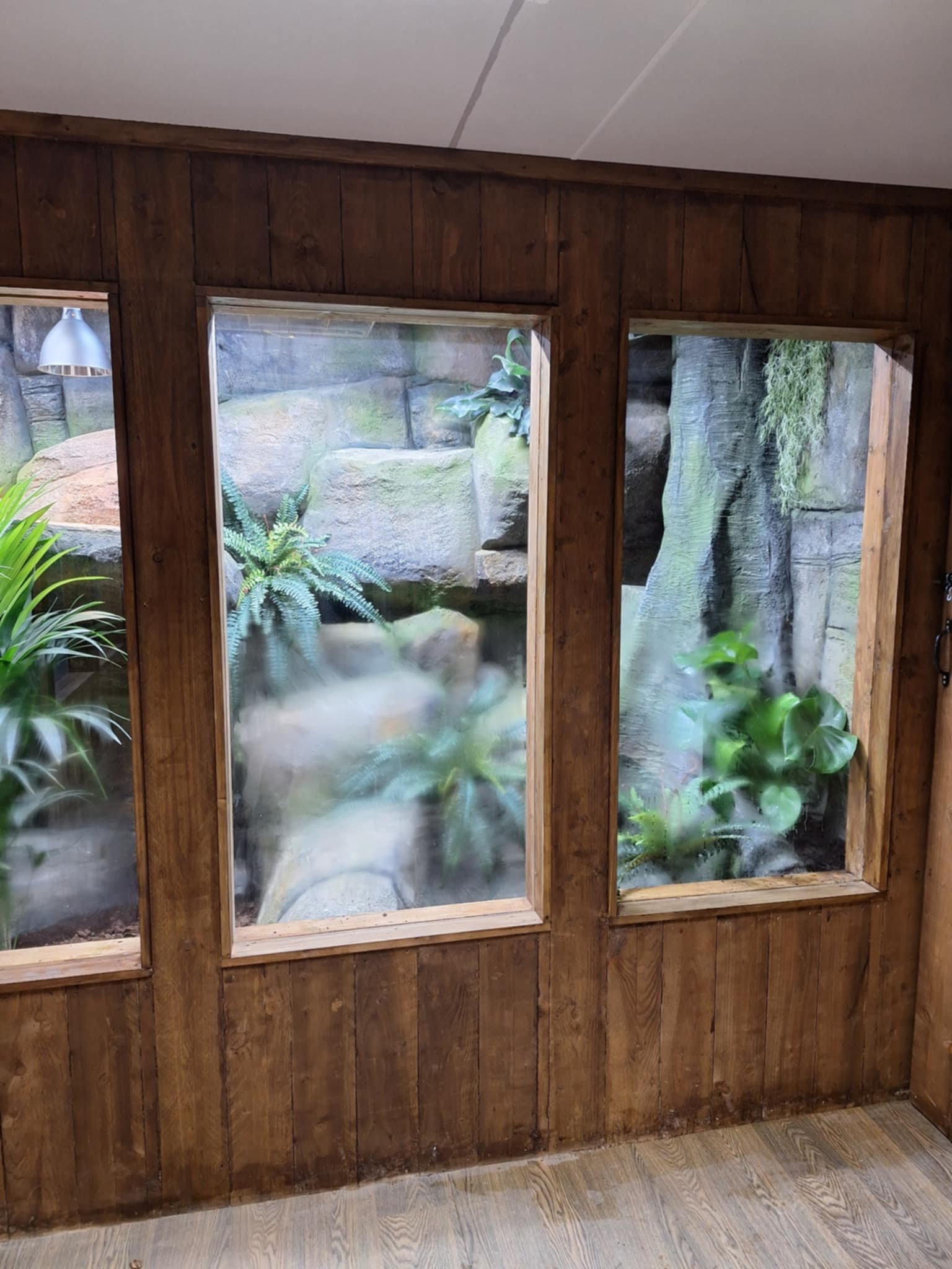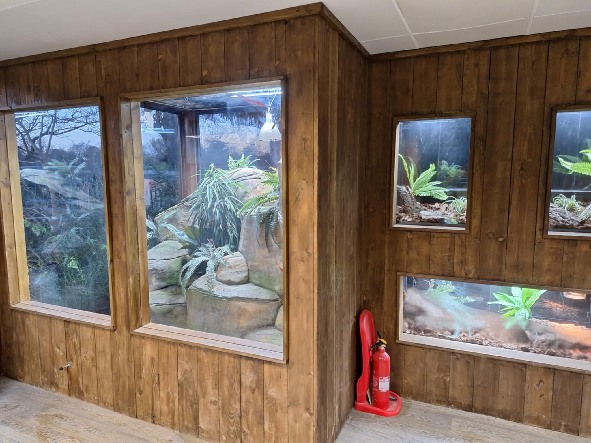The reptile house features three large, fully themed enclosures designed for larger-bodied species. Each exhibit incorporates naturalistic rockwork, durable planting, and species-specific heating and lighting systems, including dedicated basking zones, UV provision, and carefully controlled environmental gradients. Large viewing panels offer clear sightlines for guests while ensuring keepers have safe, efficient access for daily husbandry.